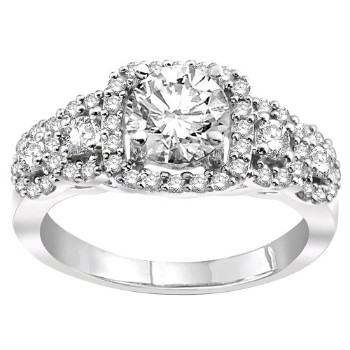 IGI Certified 14k White Gold .90ct Round-Cut-Cut Center Three Stone with Halo Diamond Bridal Ring (1.50 cttw, H-I Color, I1