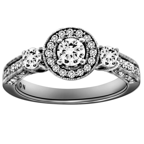 14k White Gold 1 cttw Round Diamond Milgrain "Past Present Future" Engagement Ring, Size 6